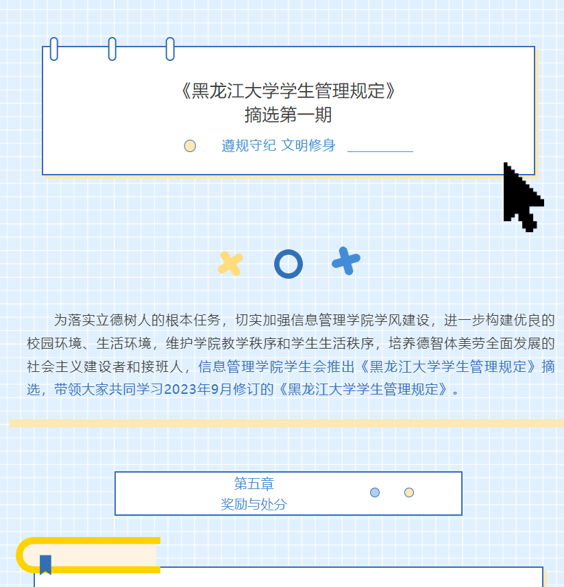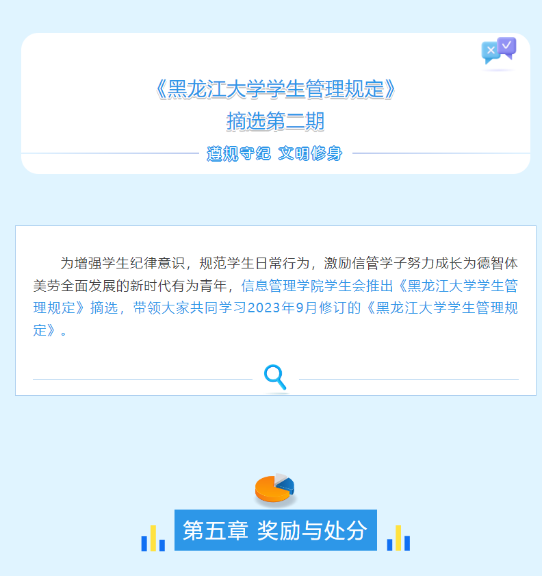 为落实立德树人的根本任务,切实加强开云在线登录学风建设,进一步构建优良的校园环境、生活环境,维护学院教学秩序和学生生活秩序,培养德智体美劳全面发展的社会主义建设者和接班人,开云在线登录学生会推出《黑龙江大学学生管理规定》摘选,于12月13日至12月17日带领大家共同学习2023年9月修订的《黑龙江大学学生管理规定》。《黑龙江大学学生管理规定》作为校园的“红绿灯”,时刻规范着同学们的言行举止。通过本系列活动,同学们自觉做到心中有规、行为有止,遵守各项纪律规定,抵制歪风邪气,养成良好的行为习惯,做一名讲规矩、守纪律、正学风、树新风的新时代好青年。