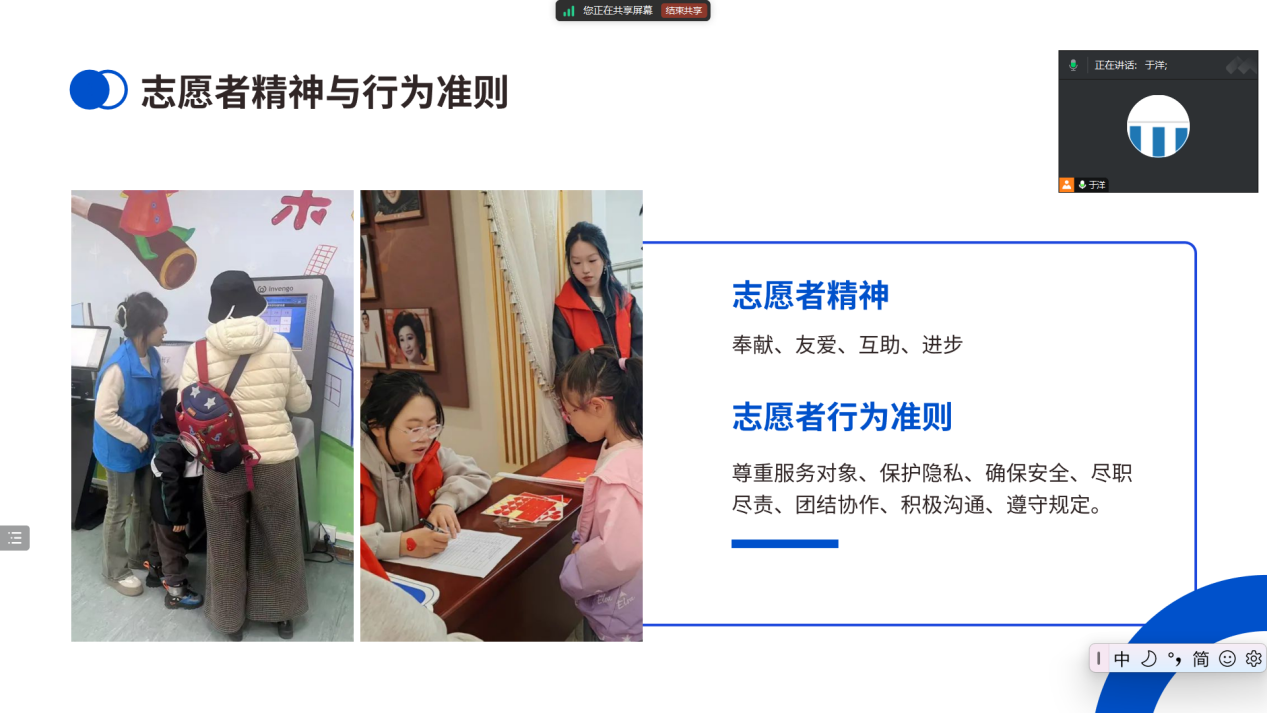 会议伊始,主讲人于洋向志愿者们讲解了志愿服务的理念、基本常识、志愿技巧和注意事项。随后,于洋强调,在志愿服务中务必注意安全,以及明确突发情况的解决方法。她结合实际案例与大家进行深入讨论,使志愿者们能够更加容易理解和掌握相关知识与技能。从如何与服务对象沟通交流,到如何应对突发情况;从志愿服务的礼仪规范,到团队协作的重要性,每一个环节都让志愿者们受益匪浅。