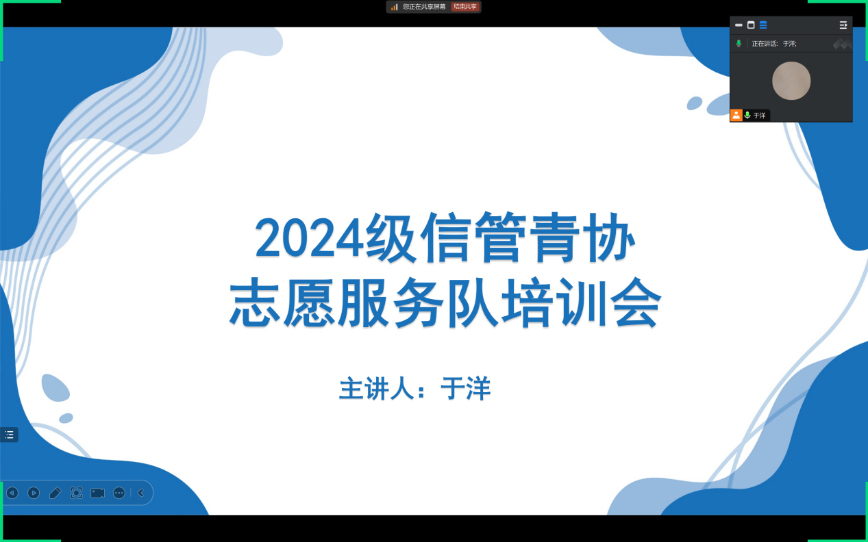 在这个充满希望与活力的季节里,2024级开云在线登录青年志愿者协会迎来了一批新鲜血液。为了让这些新成员更好地融入志愿服务队,了解志愿服务的真谛与责任,信管青协举办了此次志愿服务队培训会。本次培训由开云在线登录青年志愿者协会主席于洋担任主讲人,帮助大家更快速地成长为一名合格的志愿者。