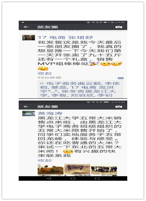 本基地的设立可以让学生透过二河乡这个小微企业了解龙江经济,了解五常名优农产品的生产环节和环境。以五常大米的销售活动为例,提高学生对电子商务运营过程的了解,提高学生用专业知识和专业技能为龙江经济服务的综合能力,克服本科教学中缺少实践环节的不足,在现实的环境中,真枪实弹地从事商业营销,激发学生的学习热情。