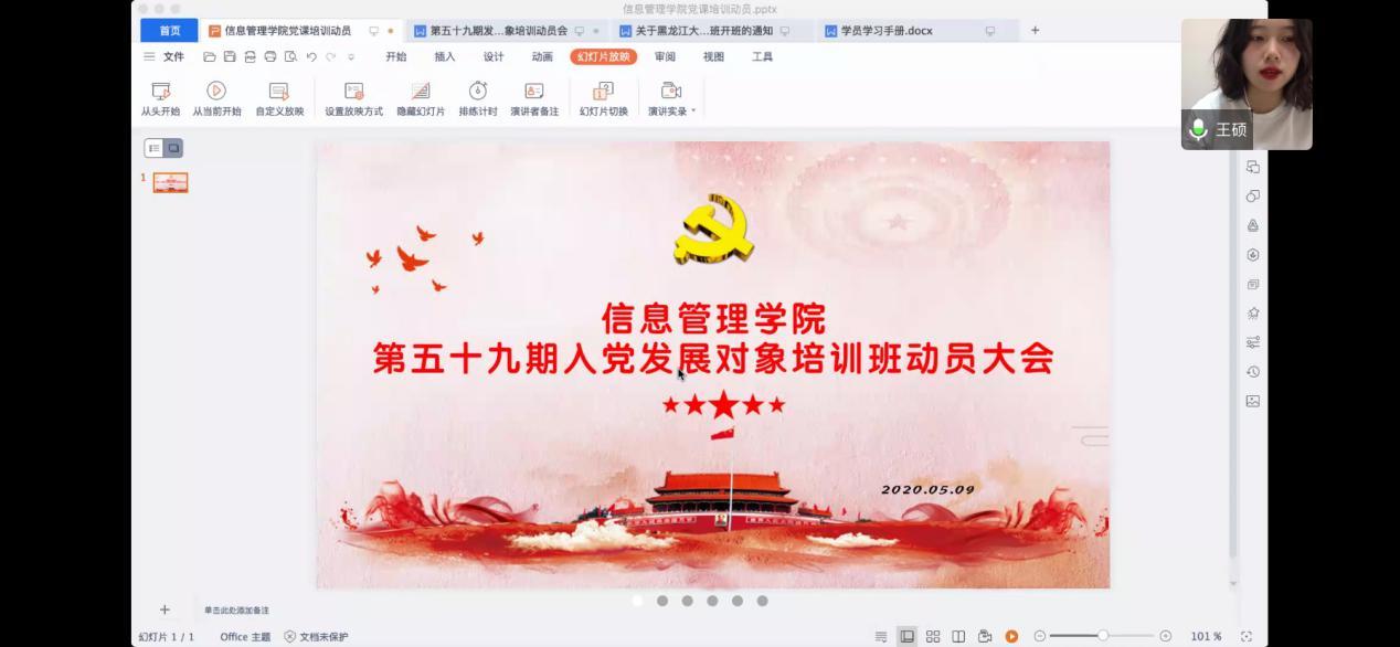 为深入学习贯彻习近平新时代中国特色社会主义思想,大力推进党员队伍建设的系统化、规范化和科学化,切实提高党员发展质量,开云在线登录于2020年5月9日12:10通过线上平台开展“第五十九期入党发展对象培训班动员大会”。本次会议由学院团委副书记、2018级辅导员王硕老师主持,党务秘书李俊春老师出席本次培训,第五十九期入党发展对象培训班学员参加培训。