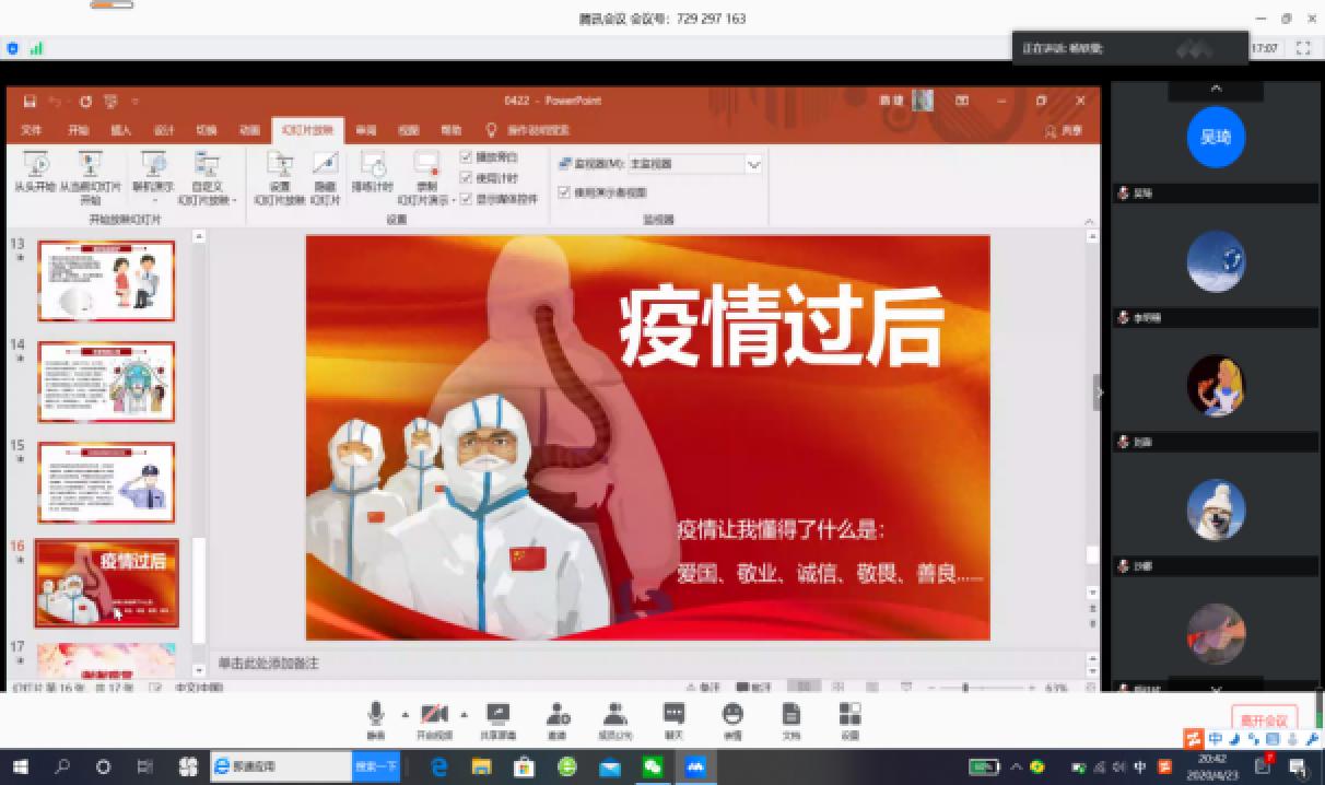 没有一个冬天不会过去,没有一个春天不会到来。疫情的阴霾还未散去,在战疫的道路上,我们更要坚定“打赢疫情攻坚战”的信念。各团支部进行视频观看、诗朗诵、志愿者发言、战疫纪录片等形式多样的内容让同学们更感受到战疫前线的中华儿女们的坚定信念与昂扬斗志,理解与明白在当前形势下青春的本质与真谛。