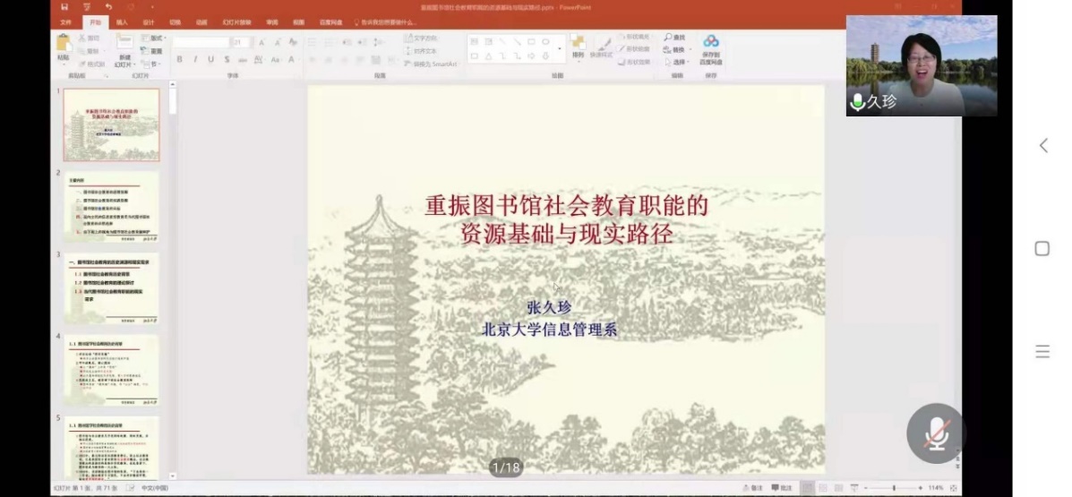 因受新冠肺炎疫情影响,整场报告以在线会议的方式进行,但这丝毫不影响报告的精彩性。张久珍教授的报告引经据典,内容丰富,学术含量高,尤其是她分享了大量由其亲自参与的图书馆社会教育活动的案例,为全院师生在图书馆社会教育方面的研究与思考拓展了视野,也为开云在线登录校庆系列学术报告活动来开了大幕。