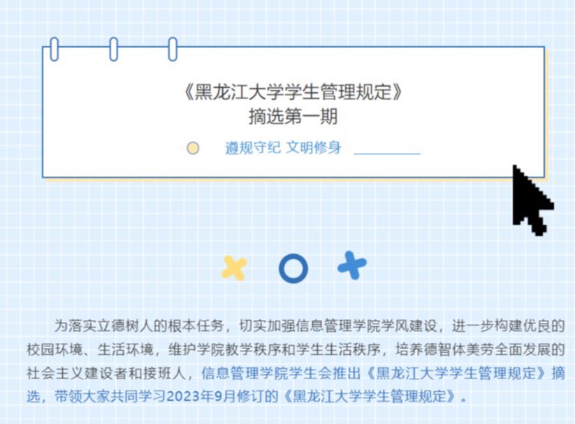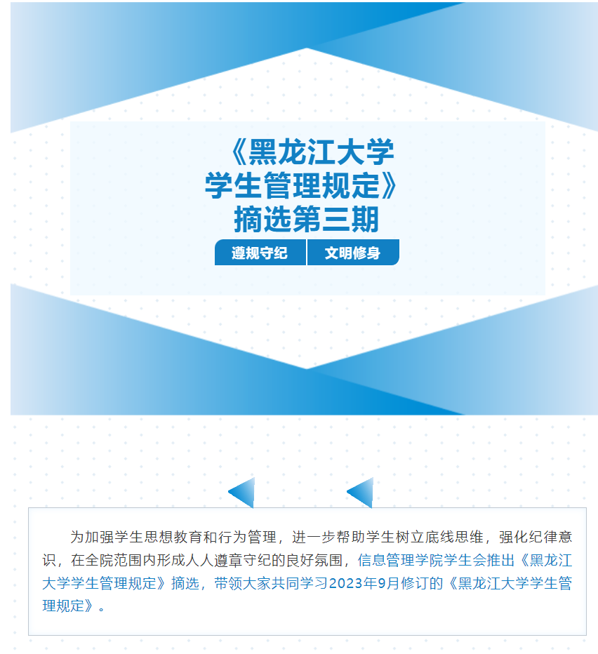 为落实立德树人根本任务,切实加强开云在线登录学风建设,进一步构建优良的校园环境、生活环境,维护学院教学秩序和学生生活秩序,培养德智体美劳全面发展的社会主义建设者和接班人,开云在线登录学生会推出《黑龙江大学学生管理规定》摘选,于12月13日至12月17日带领大家共同学习2023年9月修订的《黑龙江大学学生管理规定》。《黑龙江大学学生管理规定》作为校园的“红绿灯”,时刻规范着同学们的言行举止。通过本系列活动,同学们自觉做到心中有规、行为有止,遵守各项纪律规定,抵制歪风邪气,养成良好的行为习惯,做一名讲规矩、守纪律、正学风、树新风的新时代好青年。