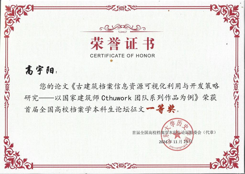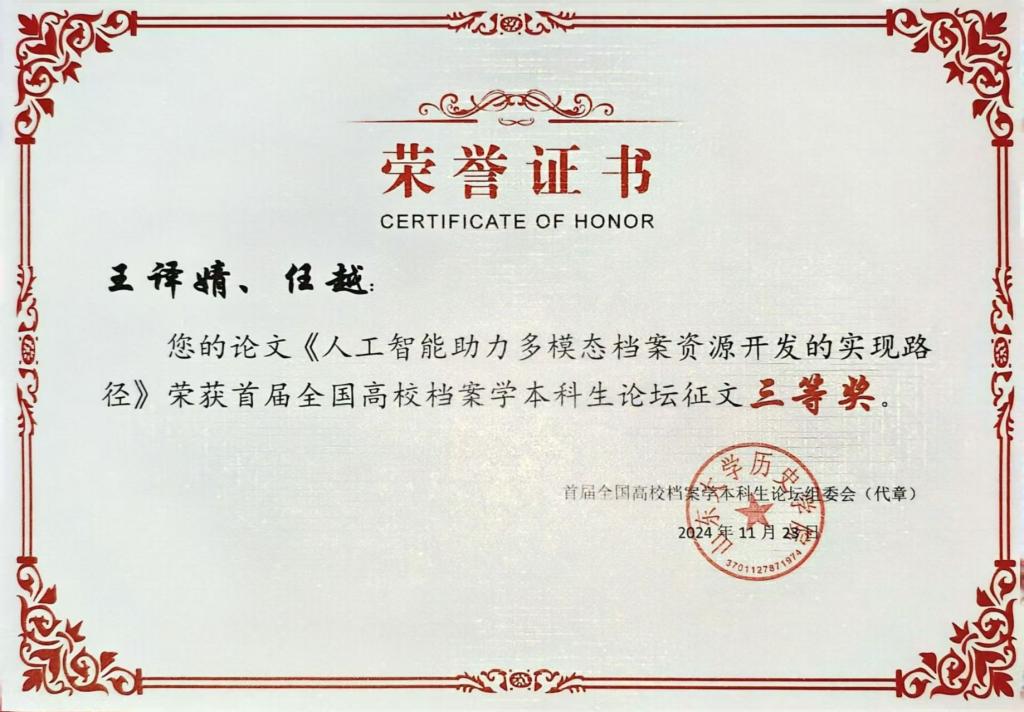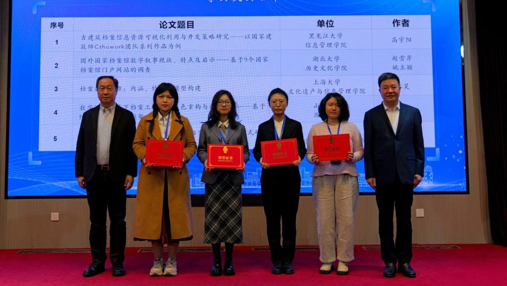 本届本科生论坛以“科技·社会·人文:数智时代的档案理论创新与实践探索”为主题。论坛共收到来自全国高校档案学专业本科生的89篇稿件,评选出一等奖6篇,二等奖9篇,三等奖15篇,优秀奖15篇。其中,我院档案学专业2022级本科生高宇阳(指导教师:任越,于元元)投稿的论文《古建筑档案信息资源可视化利用与开发策略研究——以国家建筑师Cthuwork团队系列作品为例》投稿的论文获一等奖,并作为获奖学生代表在开幕式发言;档案学专业2022级本科生王译婧(指导教师:任越,徐海静)投稿的论文《人工智能助力多模态档案资源开发的实现路径》获三等奖。